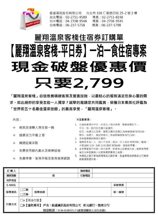 HAPPY GOING主打商品麗翔溫泉客棧平日住宿券好康36折!!