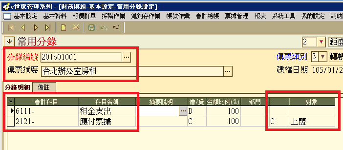 1、先執行【會計總帳】\【常用分錄設定】作業,按下圖紅色框所示輸入資料。