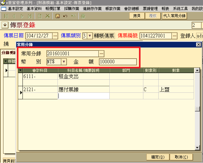 4、選擇剛才建檔的【常用分錄】,輸入幣別與金額,按下【確認】鍵,即可完成房租傳票。