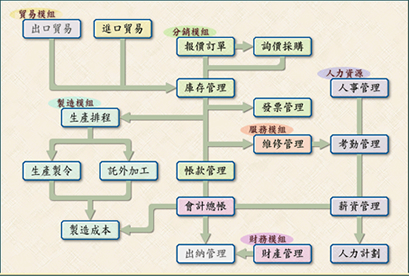 為因應不同業別需求,以ERP功能為核心,開發八大優質周邊系統,強化資源管理的涵蓋面: